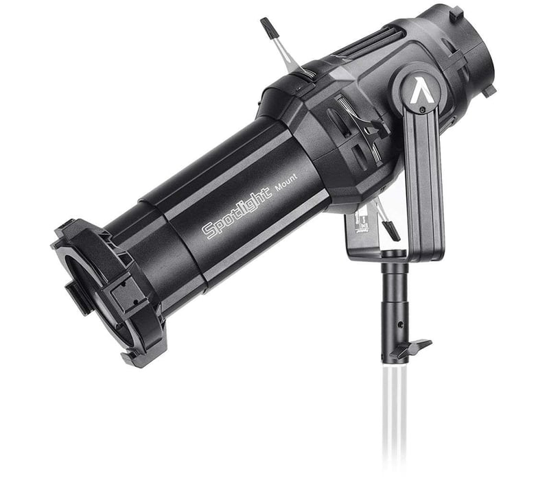Offering a high degree of control, this Aputure Spotlight Mount Set is a versatile light modifier with an included 36° lens for producing a dramatic yet clean beam of light. Featuring a Bowens mount, this modifier can be easily attached to a variety of lights, including the Light Storm LC 120d II, 120D, and 300D, and its integrated yoke has a dual junior/baby mount for attaching to anything from a C-stand to a lighting grid. The Spotlight's design incorporates a dual drop-in slot, which can accept the included B-size gobo holder, included gel holder, or an optional adjustable iris for further control over the shape and size of the light beam. Like a conventional ellipsoidal light, too, the lens can be easily swapped in order to achieve a different beam angle. The Spotlight Mount has a durable aluminum alloy housing and this kit is delivered in a hard travel case to protect the housing, lens, and accessories during transport.