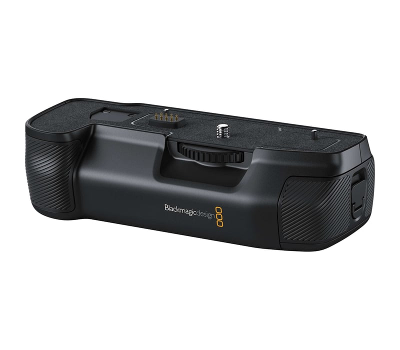 The grip installs onto the bottom of the Pocket Cinema Camera 6K Pro and provides a slide-out tray for two NP-F570 L-series batteries to add up to three hours to your shooting time. The status of both batteries displays on the camera's display. The batteries can also be charged while installed using the camera's 12 VDC power input.