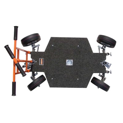 The new Round-d-Round Doorway Dolly from Matthews represents the next generation in Doorway Dollies. Based on the industry-proven Matthews Doorway Dolly, the new Round-d-Round model offers all-wheel steering which allows for greater turning flexibility and will turn in a tight 6 foot (2 meter) circle. The camera operator seat mounts in six different locations. Steering from both ends of the dolly will allow unlimited camera positioning as the dolly rolls on track with either Hot Buttons or the Matthews Centipede or on the ground with the standard pneumatic rubber tiers. The Load capacity is over 1100 pounds and the platform is carpeted for a nonslip, low-maintenance surface.