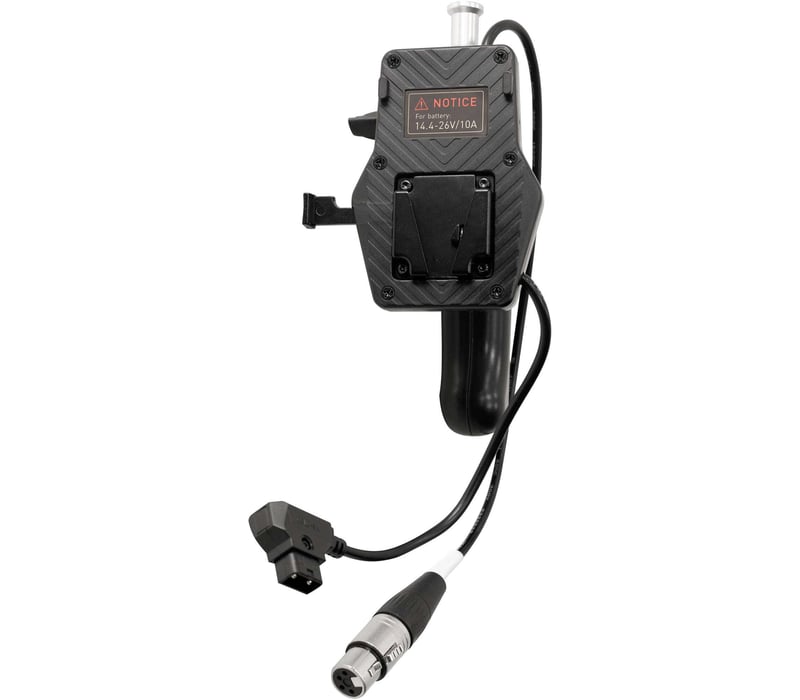 The V-Mount Battery Grip with 4-Pin XLR Connector from Nanlite allows the Forza 150 LED Monolight to be used completely untethered either handheld or mounted to a stand with the built-in 5/8" receiver. It has an attachment mount for a single, separately available V-Mount battery. A built-in D-Tap cable connects to a 14.8 or 26V battery, and a locking, female 4-pin XLR connector is also built-in to connect to the Forza 150. This lets the Forza 150 to be used on battery power without requiring to use the separate battery/AC adapter box. The grip allows creative handheld lighting techniques to be used, in addition to the Forza 150 to mount on stand as an ultracompact, all-in-one, battery-powered fixture.