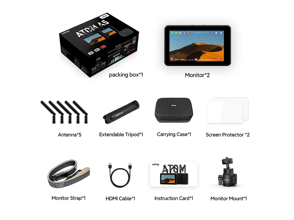 This Atom A5 Wireless Monitor Professional Package from Vaxis is a bundle of gear that features two Atom A5 monitors, antennas, screen protectors, an extendable tripod, a carrying case, and other accessories. With this bundle, you can use the two included monitors to transmit, receive, monitor, and record high-quality wireless video transmissions. The Atom A5 features a 5.5" touchscreen display that provides a sharp 1920 x 1080 resolution and 1000 cd/m² brightness.